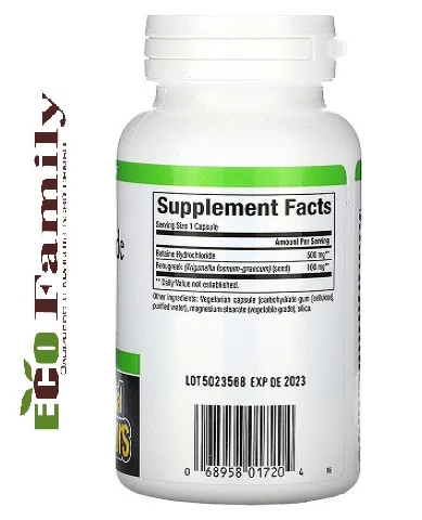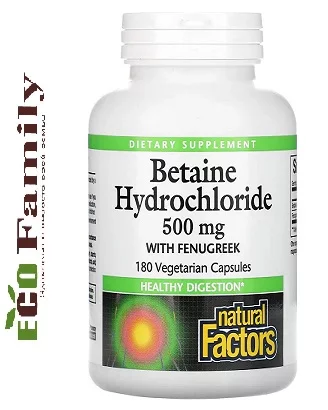 Betaine Hydrochloride від канадської компанії Natural Factors - це препарат, що поєднує пажитник з бетаїн гідрохлоридом для створення збалансованої рослинної формули для здорової функції кишечника.