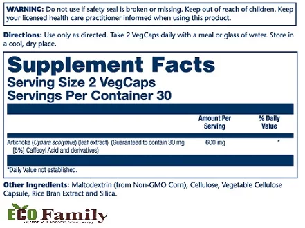 Екстракт листя артишоку (Cyanara scolymus) (гарантується зміст 30 мг [5 %] кофеоілової кислоти та її похідних) | 600 мг |