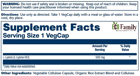 Склад:L-лізин (L-лізин HCI) -500мг, рослинна целюлозна капсула, органічна суміш екстракту рису та целюлоза.