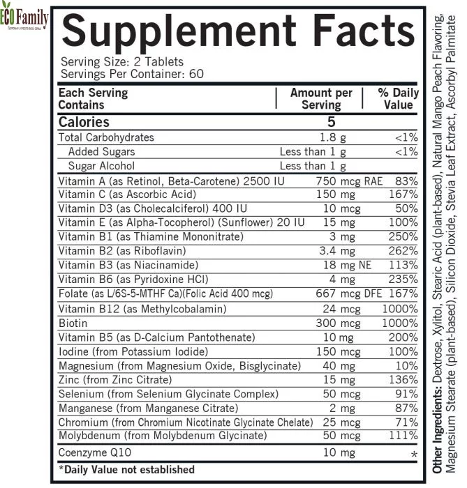 Наші жувальні мультивітаміни мають вищий потенціал, ніж багато інших дитячих мультивітамінів, доступних на ринку. У кожній вафлі ваші діти отримують вітаміни A, C, D, E, вітаміни групи B, а також важливі мінерали, такі як магній, цинк, селен, і марганець. До того ж, до складу входить коензим Q10, який підтримує енергетичний метаболізм.