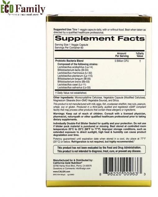 Пробіотики California Gold Nutrition Lactobif® 5 містять 8 активних пробіотичних штамів, включаючи 5 лактобацил і 3 біфідобактерії. Кожна овочева капсула містить 5 мільярдів КУО, щоб доставити в організм ефективну кількість корисних бактерій.