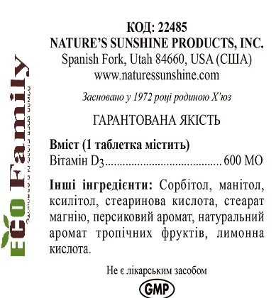 1 таблетка 355мг: вітамін D-3 (холікальціферол) - 600 МО-15 мкг, сорбітол, маннитол, ксилитол, стеаріновая кислота, стеарат магнію, натуральний ароматизатор тропічних фруктів, лимонна кислота.