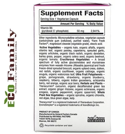 Ця унікальна біоферментованная формула забеспечена запатентованою технологією EnviroSimplex®, що поєднує в собі Farm Fresh Factors ™ - органічну суміш цілісних харчових продуктів з наземних і морських овочів - з коферментною формою вітаміну B6. Результатом є синергетична фітохімічна формула, яка забезпечує найбільш метаболічно активними поживними речовинами в ваших клітинах для негайної і прямої поживної підтримки.